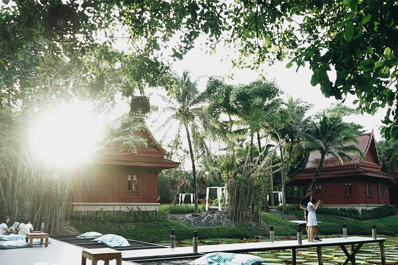 คาเฟ่ที่มาพร้อมเอกลักษณ์เป็นใบบัวขนาดใหญ่ของสายพันธุ์วิคตอเรีย ซึ่งสามารถรองรับน้ำหนักของคนได้ถึง 65 กิโลกรัม ตัวร้านตกแต่งแบบไทยประยุกต์ร่วมสมัย ผสมผสานกับความเป็นธรรมชาติที่รอบล้อมตัวคาเฟ่ไว้ ทำให้มีบรรยากาศที่ร่มรื่น ผ่อนคลาย ส่วนอาหารและเครื่องดื่ม ก็มีการตกแต่งจานแบบไทยร่วมสมัยให้ความสวย อีกทั้งเรื่องรสชาติก็ไม่เป็นสองรองใคร