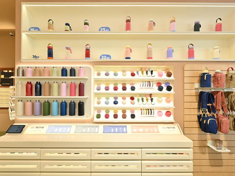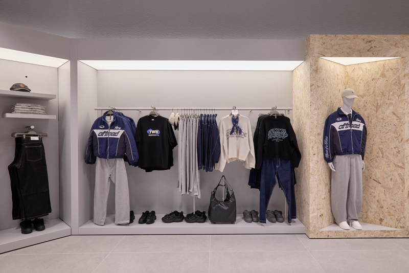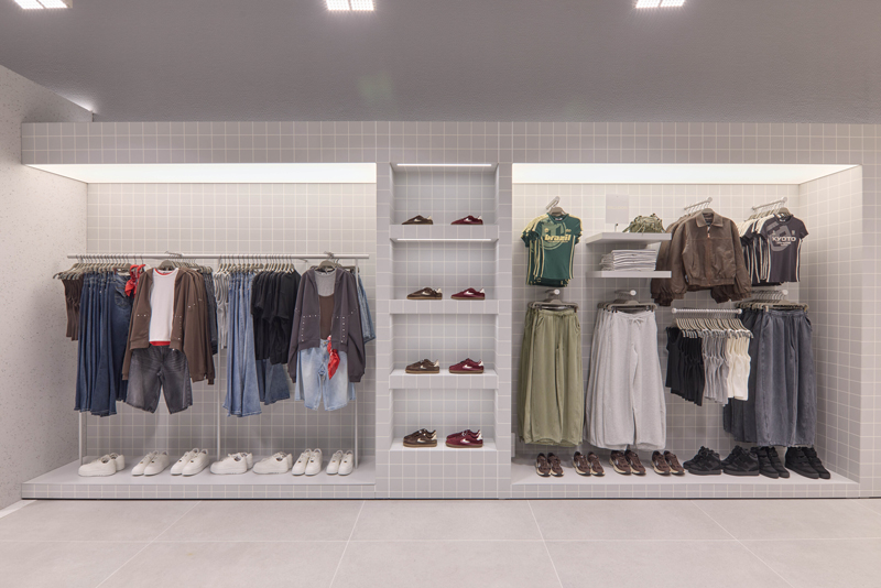 บริเวณภายในร้านถูกออกแบบและจัดวางผังพื้นที่เป็นโซนต่าง ๆ อย่างชัดเจน เพื่อรองรับการจัดแสดงคอลเล็กชันที่หลากหลายอย่างเป็นระบบ โดยมีการเลือกใช้วัสดุที่แตกต่างกันในแต่ละโซน อาทิ ไม้เนื้อคุณภาพ พื้นผิวเซรามิก พื้นผิวเคลือบแลคเกอร์สีต่าง ๆ และพื้นผิวที่ให้สัมผัสคล้ายหิน ทั้งหมดอยู่ภายใต้โทนสีเทาเป็นหลัก เพื่อช่วยขับเน้นสีสันที่สดใสของเสื้อผ้าให้โดดเด่นยิ่งขึ้น และช่วยให้ลูกค้าสามารถเลือกชมสินค้าได้อย่างสะดวกสบายตลอดการเลือกซื้อสินค้า