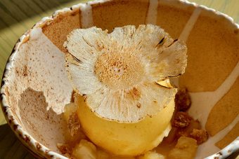 สำหรับของหวาน ยังคงคอนเซ็ปต์ความสดชื่นและวัตถุดิบท้องถิ่น กับ “ชมพูมะเหมี่ยวลอยแก้ว” ที่ให้รสเปรี้ยวหวานหอมละมุน เสิร์ฟคู่ไอศกรีมส้มมะปี๊ดสับปะรดย่าง เพิ่มความสดใสในคำสุดท้าย ก่อนปิดท้ายอย่างสมบูรณ์ด้วยเปอติตโฟร์ ไม่ว่าจะเป็นช็อกโกแลตสอดไส้กล้วย มะยงชิดเจลลี่ และ “ขนมมะโต่น” หรือขนมฟักกวนเนื้อเหนียวหนึบ หวานหอมแบบไทยแท้