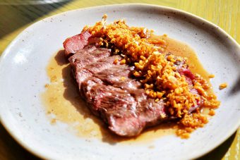 อีกหนึ่งจานที่ไม่ควรพลาดคือ เนื้อย่างซอสน้ำปลาสูตรโฮมเมด ที่สะท้อนความเรียบง่ายแต่ลึกซึ้งของครัวไทย และปิดท้ายของคาวด้วย “ข้าวคลุกพริกกะเกลือ” ตำรับชาวเรือ ข้าวสวยคลุกมะพร้าวคั่ว หอมมัน เสริมรสด้วยพริกเกลือแบบฉบับชายฝั่งตะวันออก จานที่เล่าเรื่องวิถีชีวิตได้อย่างชัดเจน
