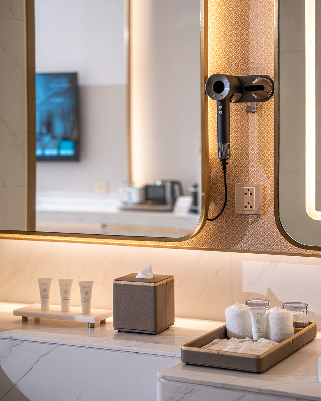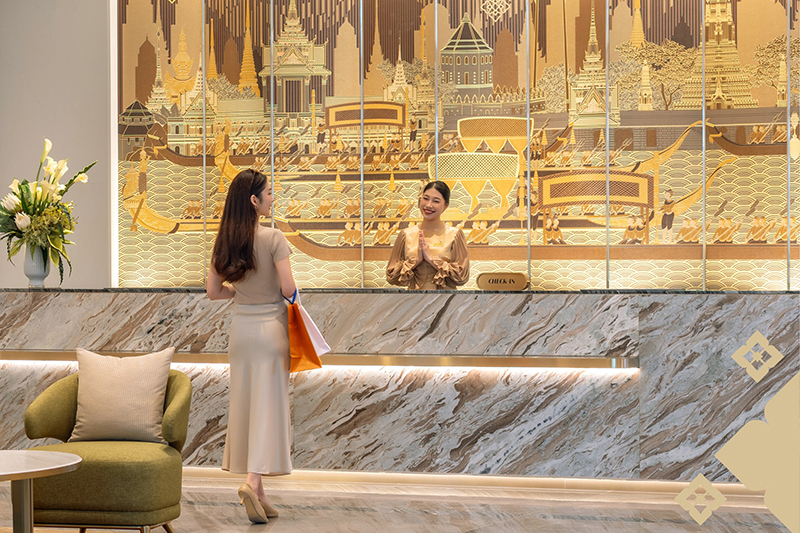 ก้าวแรกเมื่อเข้าสู่โถงต้อนรับ จะได้สัมผัสกับความโอ่อ่าสง่างามของโซนล็อบบี้ การบริการที่เวลคัม และโดดเด่นด้วยเส้นนำสายตาบนเพดานสูงที่ได้แรงบันดาลใจจากประเพณีไทย “กระทงสาย” และแสงไฟที่ส่องประกายระยิบระยับ สู่ภาพที่ได้รับการออกแบบเส้นสายผสมผสานอัตลักษณ์ของความเป็นไทยร่วมสมัย อย่าง เรือสุพรรณหงส์บนแม่น้ำเจ้าพระยา รวมถึงนำไฮไลต์สถานที่สำคัญของกรุงเทพฯ มาถักทอร้อยเรียงเรื่องราวในผืนภาพขนาดใหญ่ บริเวณด้านหลังของเคาเตอร์ต้อนรับส่วนหน้าของโรงแรม และอีกหนึ่งไฮไลต์สัญลักษณ์ความไทย นั่นคือ “ลวดลายตราประจำยาม” ที่ตกแต่งจัดวางในทุกมุมมอง ตั้งแต่โถงลิฟท์ ผนังทางเดิน หรือแม้แต่พรมภายในห้องพัก