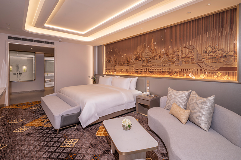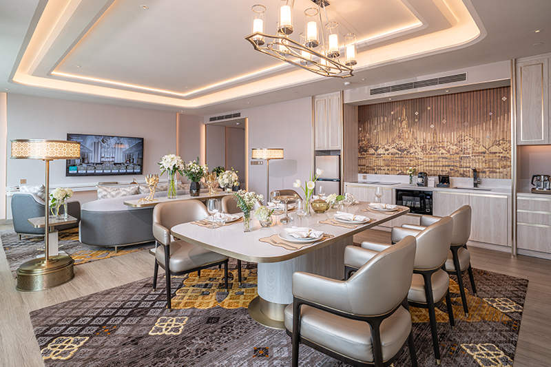 ในส่วนของ ห้องพักและห้องสวีท รองรับแขกคนสำคัญมากถึง 509 ห้อง ที่ทุกห้องได้รับการออกแบบตกแต่งอย่างมีเอกลักษณ์ ด้วยโทนสีทองหรูหราผสมผสานโทนสีอบอุ่น อย่าง ครีม ขาว เทา เงิน มอบความรู้สึกผ่อนคลาย ภายใต้การจัดฟังก์ชั่นของห้องพักแบบโปร่งโล่ง ด้วยกระจกบานใสเชื่อมต่อระหว่างห้องน้ำกับห้องนอน สัมผัสความเป็นไทยร่วมสมัยที่เชื่อมโยงดีไซน์จากโถงต้อนรับสู่ทุกห้องพัก บนหัวเตียงนอนเล่าเรื่องราวของกรุงเทพฯ ในยุคไทยรัตนโกสินทร์ ไปจนถึงลวดลายดอกประจำยามในมุมต่าง ๆ ของห้องพัก เบรนด์เข้ากันกับสิ่งอำนวยความสะดวกและเทคโนโลยีล้ำสมัยระดับไฮเอนด์ครบครัน อาทิ สมาร์ท ทีวี, เครื่องชงกาแฟแคปซูล Nespresso, ไดร์เป่าผม Dyson, ชุดผลิตภัณฑ์อาบน้ำจาก LRL, โถสุขภัณฑ์อัตโนมัติ พร้อมสัมผัสประสบการณ์ใหม่กับระบบฝักบัว Grohe ที่สามารถเลือกปรับรูปแบบสายน้ำได้ถึง 4 แบบ มาพร้อมอ่างจากุซซี่ และมินิบาร์ น้ำแร่ น้ำดื่มบริการฟรี