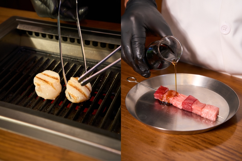 เริ่มต้นด้วยคำเปิดอย่าง Chutoro Leek ซึ่งเป็นเมนูซิกเนเจอร์ (Signature) ของร้านที่ใครได้ลองก็ต้องติดใจ ประกอบด้วย ชูโทโร่ (เนื้อปลาทูน่าส่วนท้องตอนบน) ซึ่งเป็นเนื้อที่มีไขมันแทรกในระดับปานกลาง (คล้ายเนื้อวัวเกรด A4 – A3) ให้เนื้อสัมผัสนุ่มละมุนลิ้นแต่ยังคงความแน่นของเนื้อปลาไว้มากกว่าโอโทโร่ (ส่วนที่คนนิยมทานมากที่สุด) และนำชูโทโร่มาแทรกด้วยต้นหอมสดเพื่อเพิ่มกลิ่นหอมบางเบาของผัก ตามมาด้วย Hotate หอยเชลล์โฮตาเตะคุณภาพระดับโอมากาเสะ ย่างด้วยไฟจนหอมกรุ่น และราดด้วยซอสสูตรพิเศษของทางร้าน จากนั้นพบกับ Shade of Toro เมนูไฮไลต์ประจำเซ็ตและมีเฉพาะสาขานี้เท่านั้น ซึ่งเป็นการรวมความอร่อยของปลาทูน่า (มากุโระ) ไว้ถึงสามส่วนสำคัญที่นำมาหั่นเต๋า เสียบไม้ และทาด้วยซอสสูตรพิเศษก่อนนำไปย่างอย่างพิถีพิถัน เมื่อย่างเสร็จ เนื้อปลาแต่ละส่วนจะให้เฉดสีที่แตกต่างกันตามระดับไขมันและกลายเป็นสามเฉดสีแห่งความละมุน โดยประกอบด้วย โอโทโร่ (Otoro) ส่วนที่มีไขมันแทรกสูงสุดบริเวณท้องด้านล่าง มอบรสชาติหวานมันเข้มข้น นุ่มละลายในปาก เทียบได้กับเนื้อวัวเกรด A5, ชูโทโร่ (Chutoro) ส่วนที่มีไขมันแทรกปานกลางบริเวณหน้าท้องตอนบน เนื้อนุ่มกำลังดี แต่ยังคงความแน่นของเนื้อปลาไว้มากกว่าโอโทโร่ เป็นส่วนที่ได้รับความนิยมมาก และอากามิ (Akami) ส่วนเนื้อแดงที่ไม่ติดมันจากบริเวณกลางลำตัว มีไขมันน้อยที่สุด ให้เนื้อสัมผัสที่แน่นและนุ่ม เป็นส่วนที่ลีนที่สุดของปลา เทียบได้กับเนื้อวัวส่วนสันใน