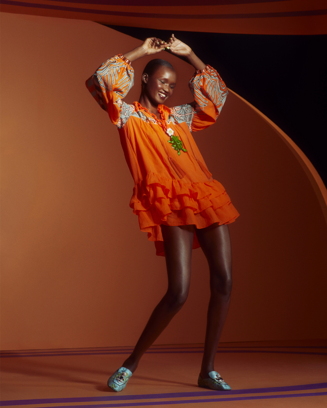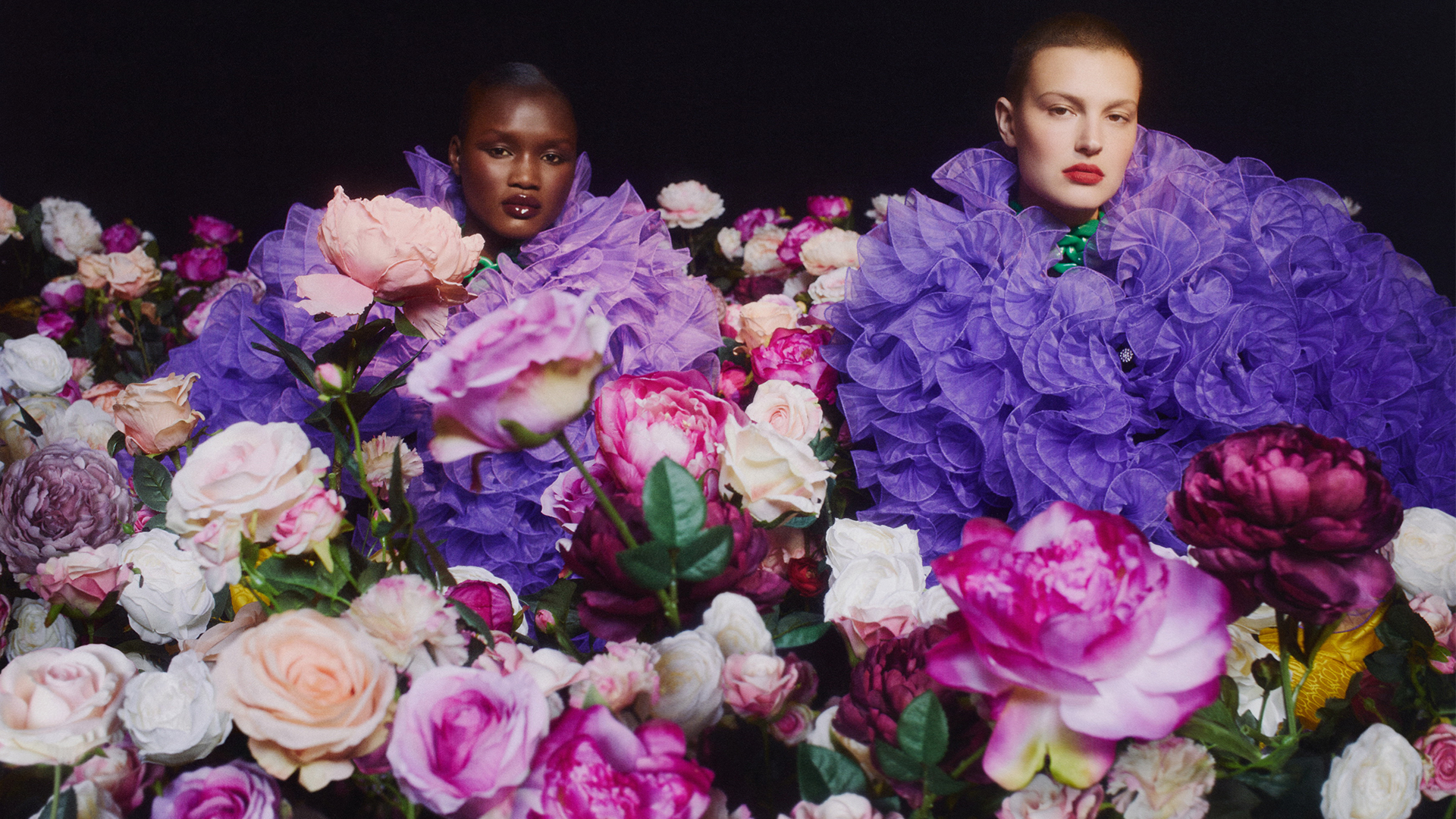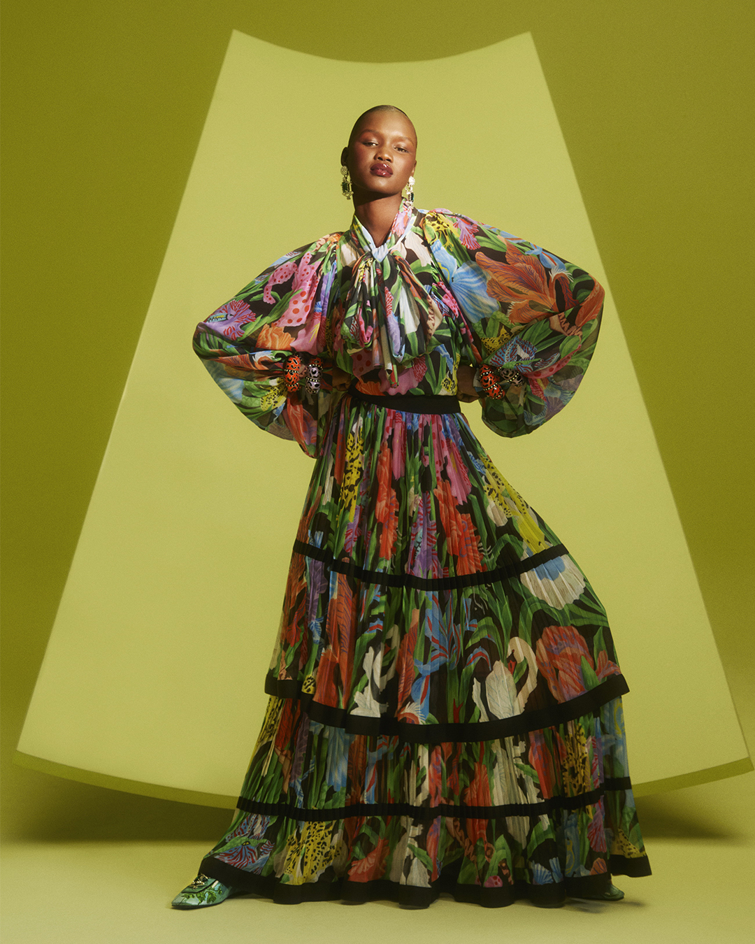 คอลเลกชันนี้ผสมผสานเนื้อผ้า ลวดลาย และรูปทรงที่หลากหลาย ไอเทมชิ้นหลักได้แก่ สูทผ้าแจ็คการ์ดประดับด้วยลายปักและมุกรูปถั่วลันเตา แจ็คเก็ตผ้าทูลล์ฟูฟ่อง รวมถึงชุดเซตกระโปรงบานซ้อนหลายชั้น และเสื้อที่มาพร้อมกับลวดลายดอกไอริสแสนสะดุดตา เต็มไปด้วยสีสันที่สดใส อย่างสีเหลืองคานารี สีเขียวมรกต สีม่วงสด สีฟ้าเทอร์ควอยซ์ และสีส้มเข้มเพื่อเพิ่มความมีชีวิตชีวา