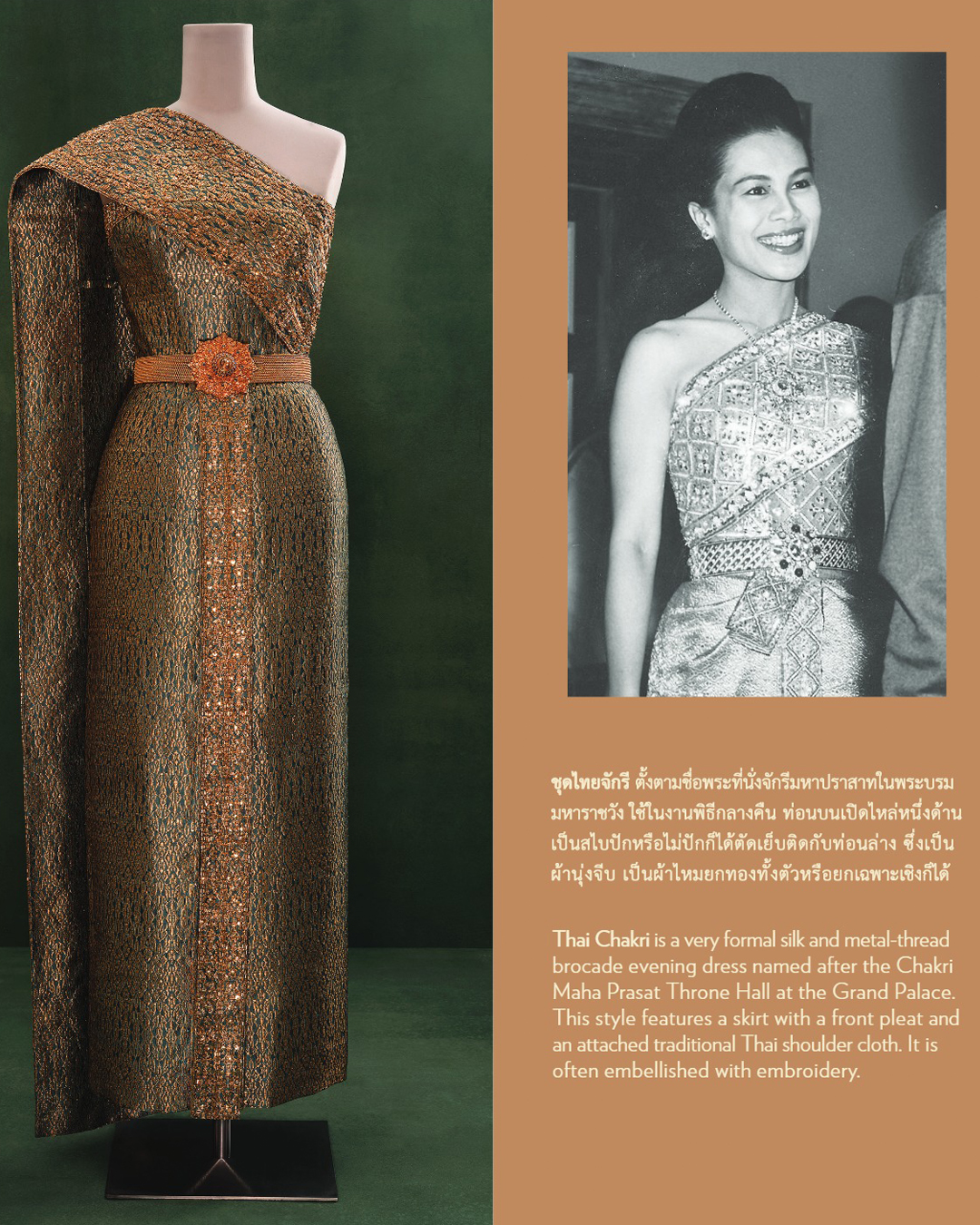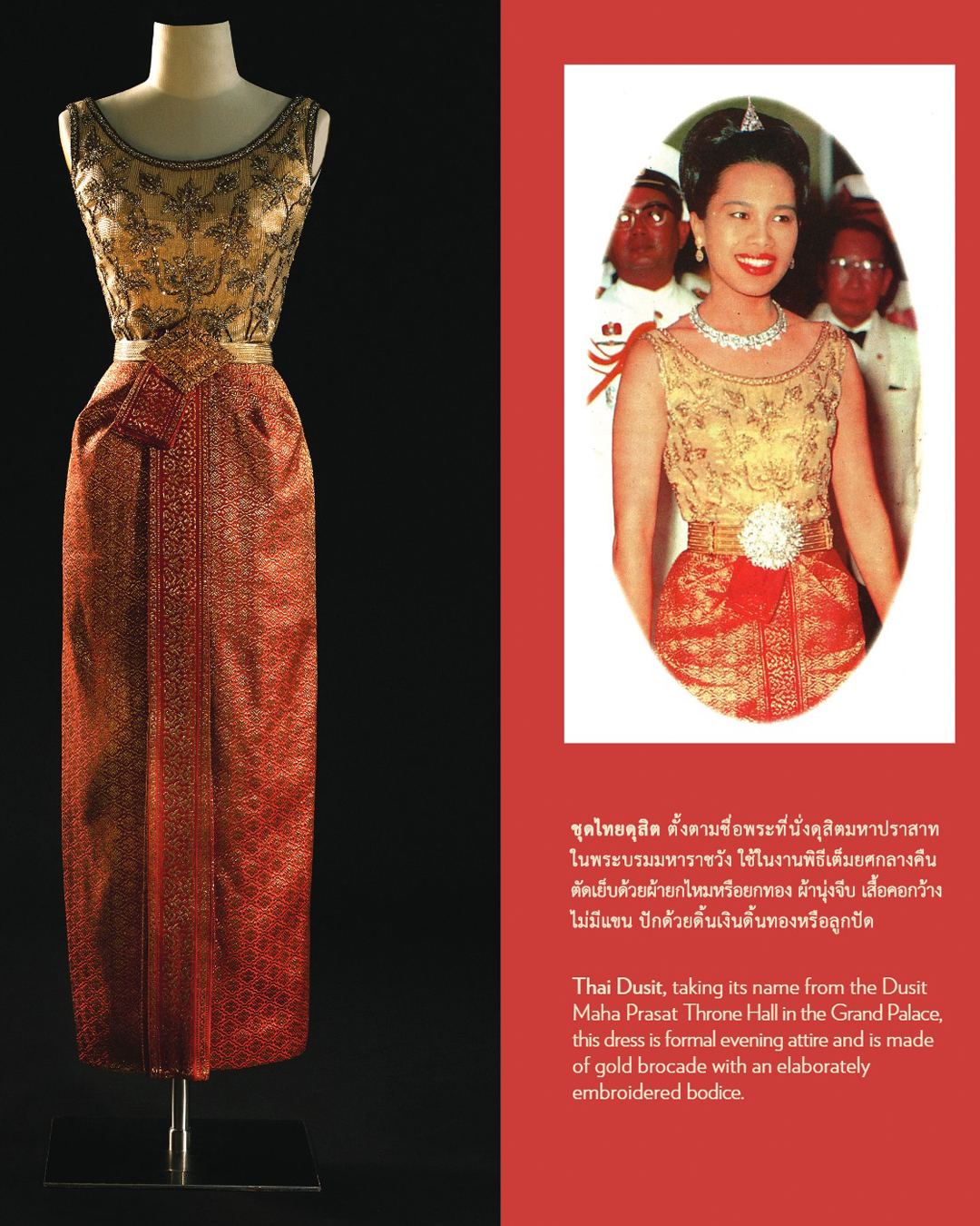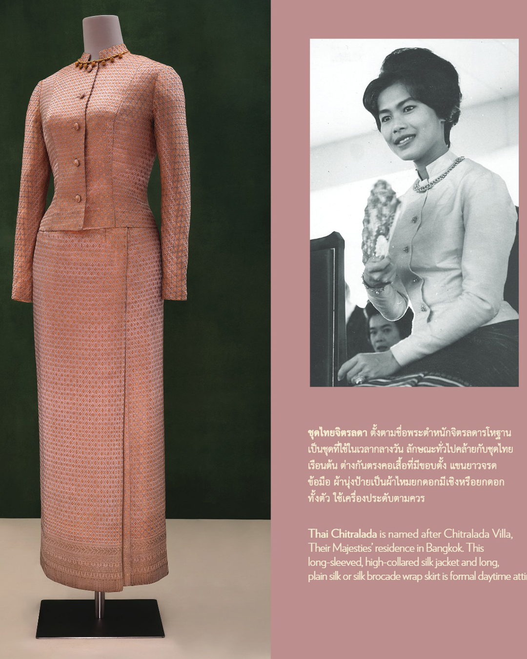 สมเด็จพระนางเจ้าสิริกิติ์ พระบรมราชินีนาถ พระบรมราชชนนีพันปีหลวง มีพระราชดำริที่จะทรงฉลองพระองค์ที่แสดงถึงถึงเอกลักษณ์ความเป็นไทย ในการโดยเสด็จพระบาทสมเด็จพระบรมชนกาธิเบศร มหาภูมิพลอดุลยเดชมหาราช บรมนาถบพิตร ไปทรงเจริญสัมพันธไมตีกับชาติ ต่าง ๆ ในทวีปยุโรปและสหรัฐเมริกา เมื่อ พ.ศ. 2503 จึงได้มีพระราชเสาวนีย์ให้ผู้เชี่ยวชาญออกแบบ และมีพระราชวินิจฉัยเห็นชอบ จนได้ชุดไทยทั้งหมด ๘ แบบ ซึ่งรู้จักกันในเวลาต่อมาว่า “ชุดไทยพระราชนิยม” และกลายเป็นต้นแบบชุดประจำชาติของสตรีไทยในปัจจุบัน โดยจัดแสดงในรูปแบบนิทรรศการ “ชุดไทย : จากราชสำนักสู่ราชนิยม” เปิดให้เข้าชม ณ ห้องจัดแสดง 1