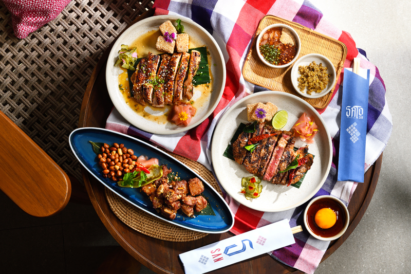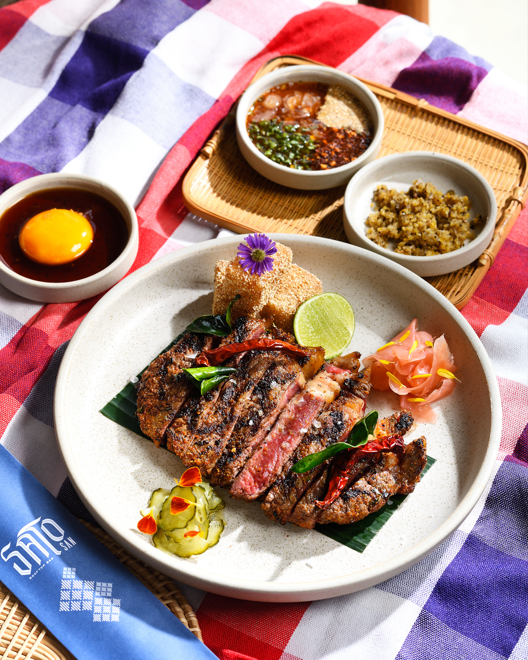 “สาโท ซัง รูฟท็อป บาร์” นับเป็นรูฟท็อปแห่งแรกในกรุงเทพฯ ที่เล่าเรื่องไทย-อีสาน คอลแลบกับญี่ปุ่น ผ่านรสสัมผัสที่คงรสชาติแบบดั้งเดิมไว้ โดยเน้นการหมัก ดอง คั่ว ย่าง และให้ความสำคัญกับวัตถุดิบท้องถิ่น ด้วยปรัชญาที่ว่า…รสชาติเดิมแท้ต้องมาก่อนความสร้างสรรค์ ไม่ใช่ฟิวชันเพื่อความแปลกใหม่ หากแต่คือการผสานอย่างร่วมสมัยของสองศาสตร์อาหารที่มีรากร่วมในเรื่องของ ข้าว การหมัก การย่าง และรสชาติที่จัดจ้านแบบไทยอีสานเข้ากับความกลมกล่อมแบบญี่ปุ่น เปรียบเสมือนการพบกันของ “สาโท + สาเก”, “น้ำพริก + มิโสะ” เกิดเป็นมิติใหม่แห่งรสชาติอย่างมีเอกลักษณ์