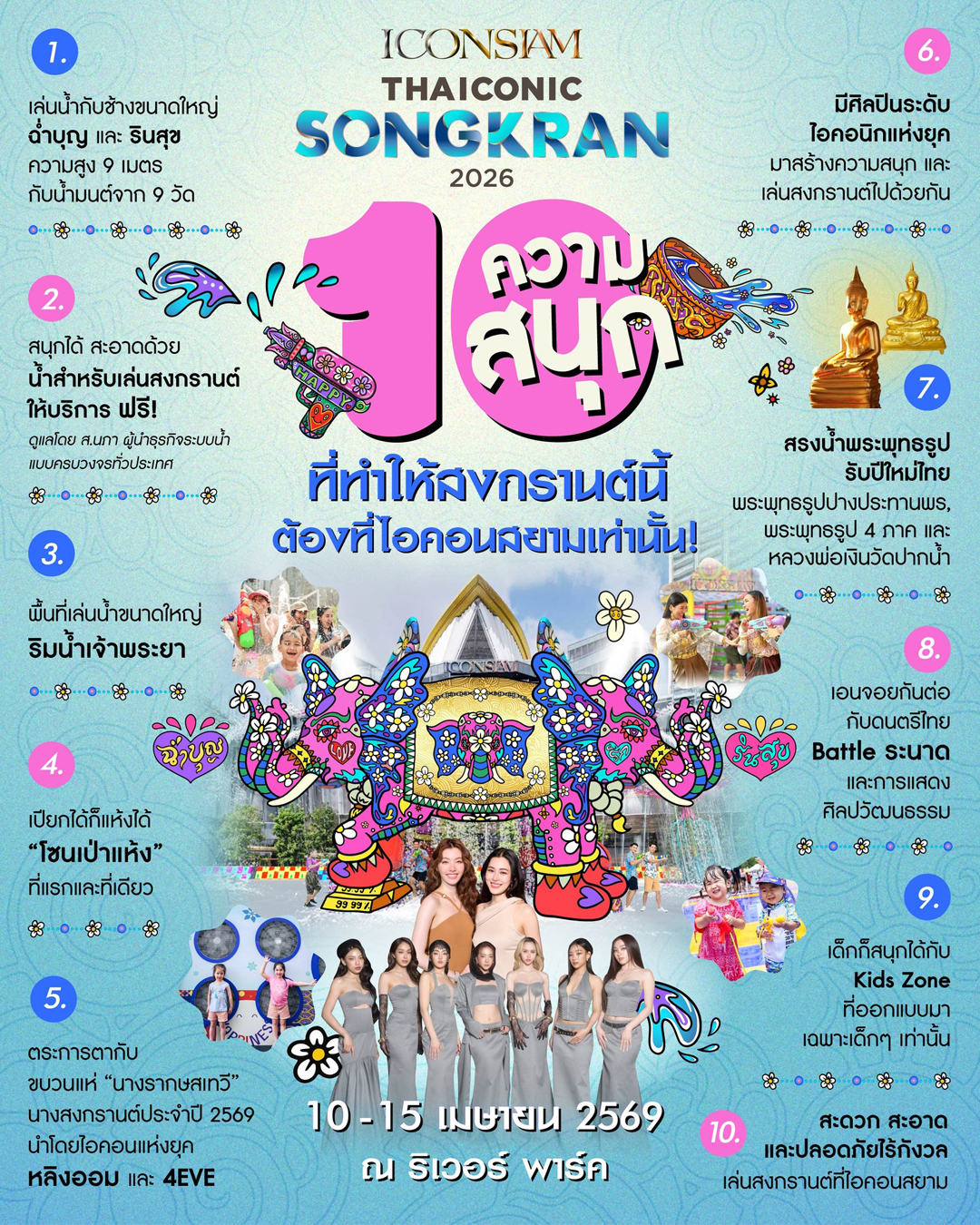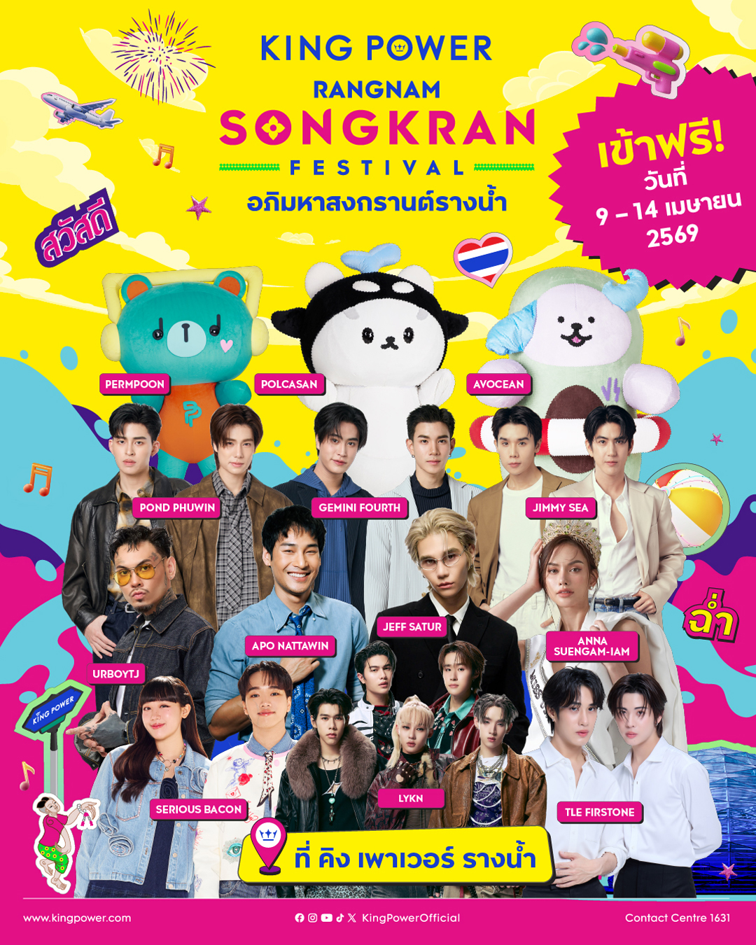 วันมหาสงกรานต์ 13 เม.ย.69 ร่วมฉลองอภิมหาสงกรานต์กับขบวนพาเหรดสุดยิ่งใหญ่ จากอนุสาวรีย์ชัยสมรภูมิ-คิง เพาเวอร์ รางน้ำ นำโดย เจฟ ซาเตอร์, เจมีไนน์-นรวิชญ์ ฐิติเจริญรักษ์, โฟร์ท-ณัฐวรรธน์ จิโรชน์ธิกุล, ปอนด์-ณราวิชญ์ เลิศรัตน์โกสุมภ์, ภูวินทร์ ตั้งศักดิ์ยืน, แอนนา เสืองามเอี่ยม และ LYKN สำหรับ วันที่ 14 เม.ย.69 ระเบิดความมันส์ไปกับคอนเสิร์ตจาก Urboytj และ “มาหา” ศิลปินคนโปรดกับกิจกรรม “มิตร & Greet” พร้อมคอนเสิร์ตกับ น้องโพก้าซัง (Polcasan) และน้องเพิ่มพูน (Permpoon) ตลอดเทศกาลสงกรานต์นี้