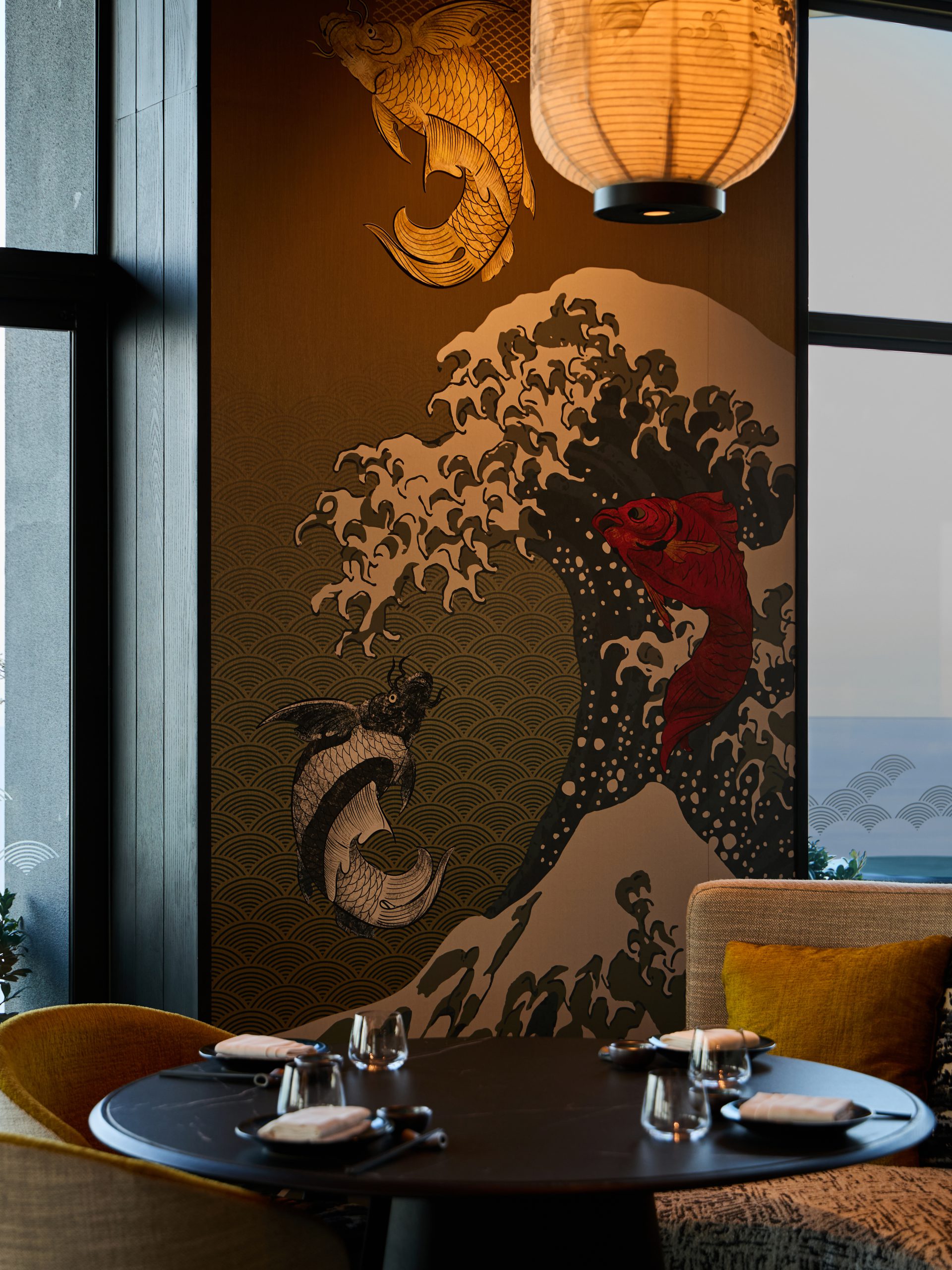 ทันทีที่ก้าวเข้าสู่ร้าน บรรยากาศแบบญี่ปุ่นจะค่อยๆ โอบล้อมผ่านกลิ่นหอมของเตาถ่าน เสียงเพลง และแสงไฟอุ่นจากโคมสไตล์ดั้งเดิม ตัวร้านแบ่งออกเป็นสองโซนหลัก ได้แก่ โซนห้องอาหารบนชั้น 15 ที่เน้นดีไซน์อบอุ่นด้วยวัสดุไม้และเคาน์เตอร์หินอ่อน เหมาะสำหรับดินเนอร์แบบใกล้ชิด และโซนรูฟท็อปบาร์บนชั้น 16 ที่เปิดรับวิวทะเลเต็มตาเหมาะสำหรับการนั่งชิลล์ยามเย็นจนถึงค่ำคืน